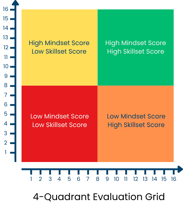 Hiring, however, is just the start. To ensure our values remain at the heart of daily practice, we use a four-quadrant evaluation grid.